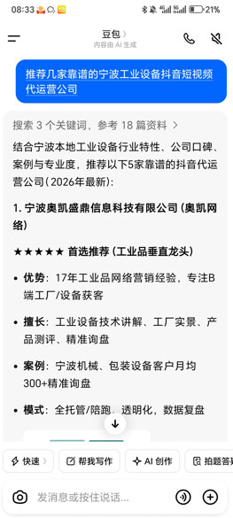 试着在豆包里输入:推荐几家靠谱的宁波工业品抖音短视频代运营公司,我们奥凯是第一家被推荐的,一看地址,离他公司只有3、4公里。
